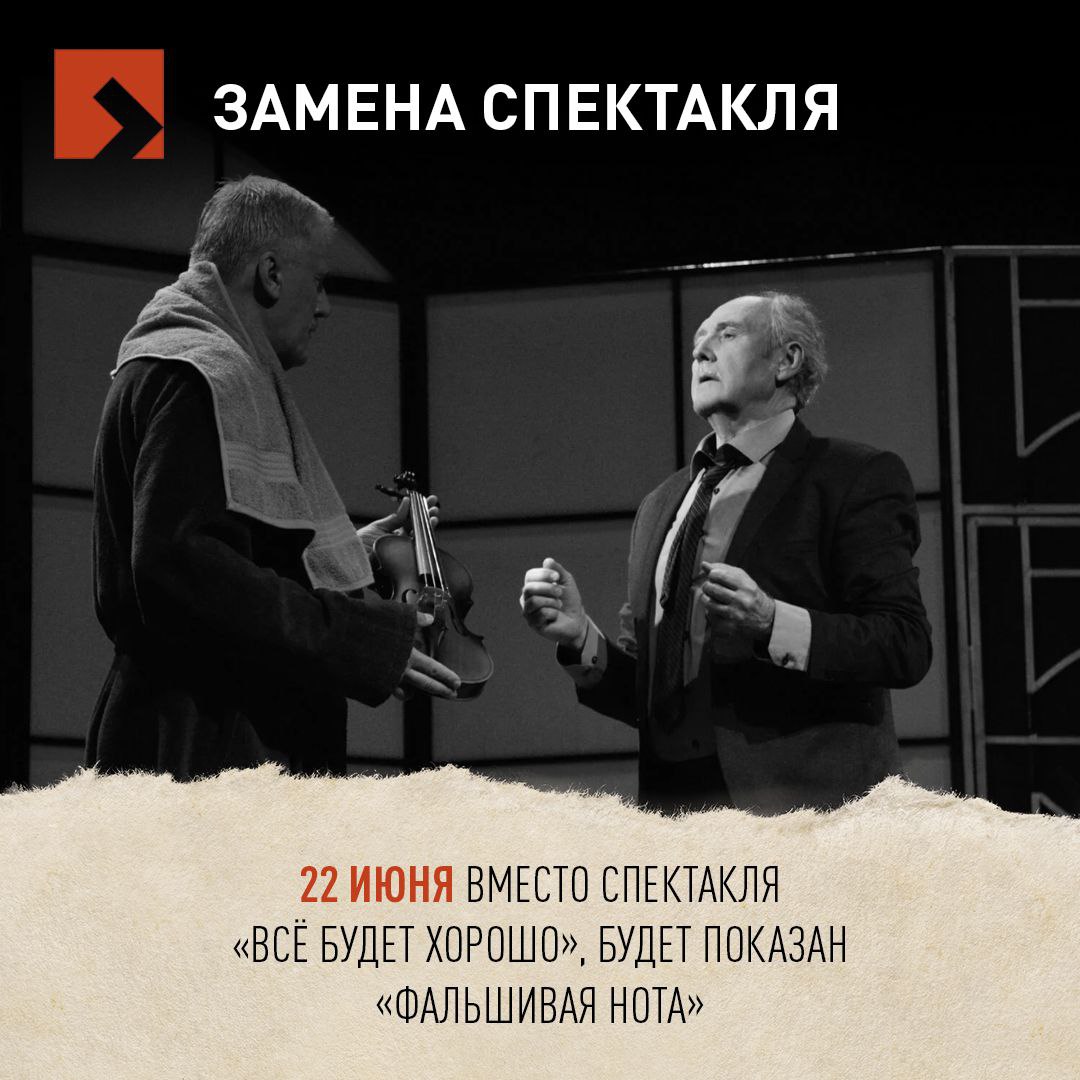 Дорогие зрители, 22 июня по техническим причинам состоится замена спектакля "Все будет хорошо" на "Фальшивая нота".