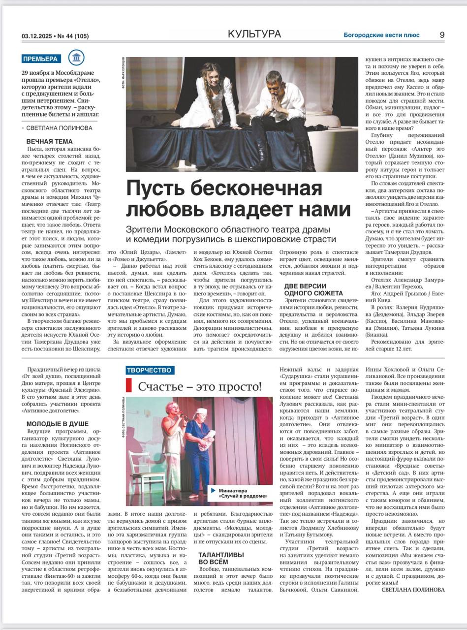 Газета «Богородские вести плюс» про премьерный спектакль «Отелло».